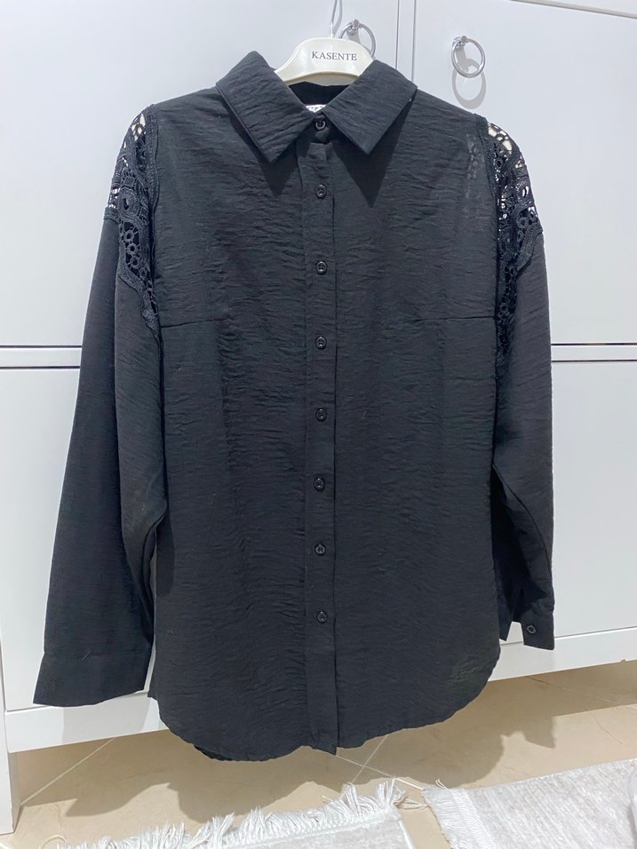 Siyah uzun kollu kadın gömlek, düğmeli ve yakalıdır. Omuzlarda nakış detayları bulunur, bol kesim ve normal boydadır. Günlük tarzda şık bir seçim.