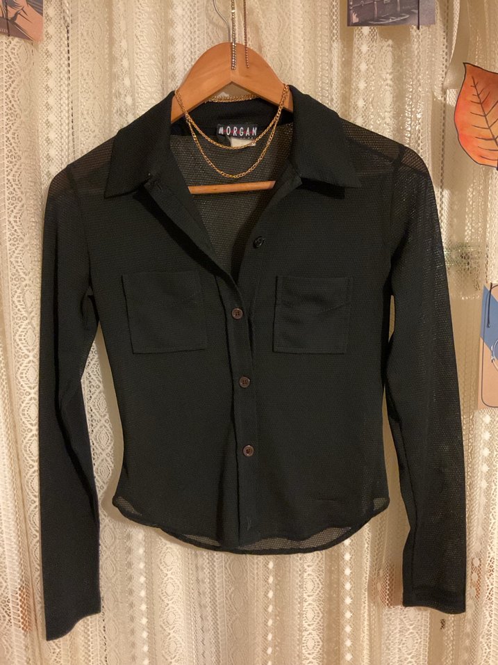 Siyah fileli keten kumaştan, düğmeli, uzun kollu, yakalı ve iki cep detaylı kadın gömlek. Rahat ve şık sokak stili için uygundur.