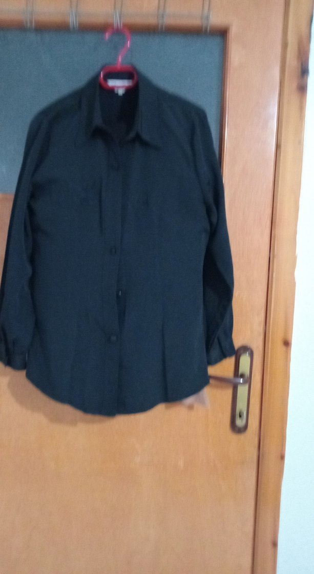 Düğmeli, uzun kollu siyah kadın gömlek. Notlu yaka ve rahat kesim, ofis kullanımı için uygun.