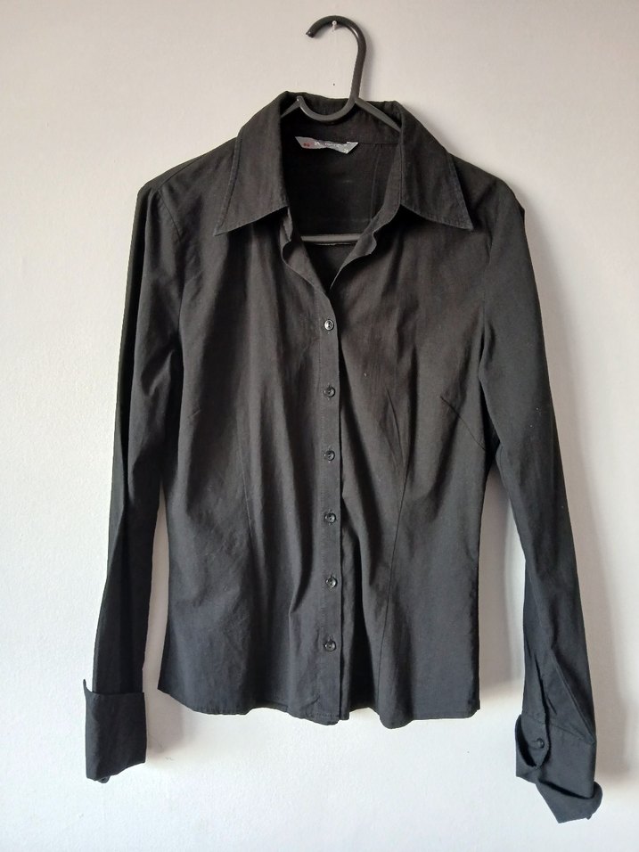 Düğmeli, yakalı ve uzun kollu siyah kadın gömleği.