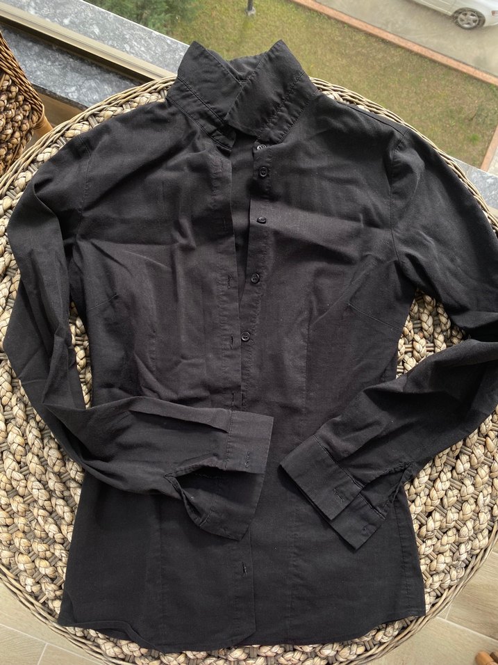 Düğmeli, siyah gömlek, uzun kollu ve yakalıdır. Ofis için uygun, gotik tarzda sade bir modeldir.