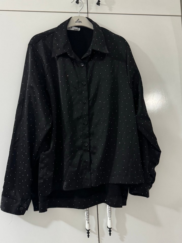 Düğmeli, uzun kollu, siyah keten gömlek. Rahat kesimi ve çıtçıtlı yakasıyla günlük kullanıma uygun, sokak stiline uygun bir parça.