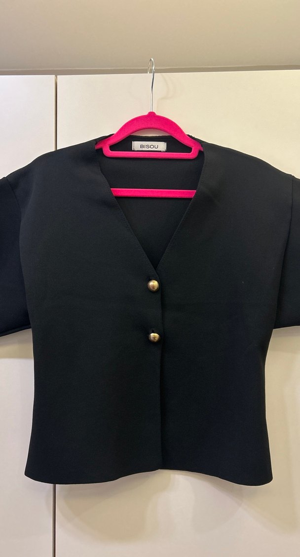 Düğmeli, siyah kadın gömlek, kesik yaka ve kısa kolludur. Normal midi boyda, sentetik kumaştan yapılmıştır ve ofis için uygundur. BISOU markalıdır.