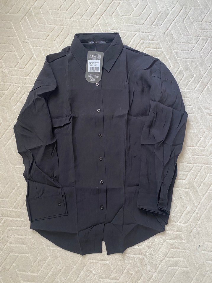 Düğmeli ön kısmı ve notched yakası olan siyah kadın gömleği, uzun kollu ve regular fit kesimdedir. Ofis kullanımı için uygundur.