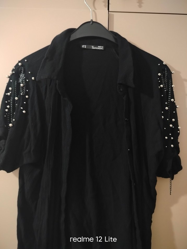 Siyah gotik kadın gömleği, yakalı ve kısa kolludur. Zincir ve boncuk detayları bulunur. Düğmeli, bol kesim ve sentetik kumaştandır. Günlük kullanıma uygundur. L bedene uygundur