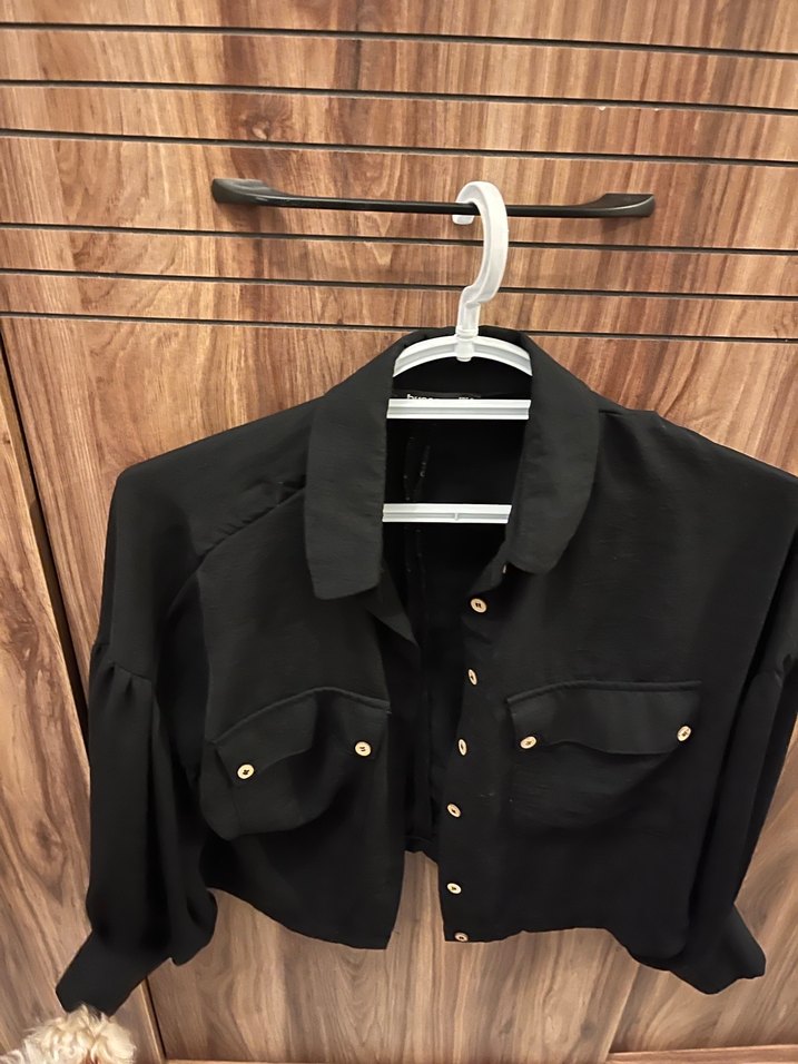 Düğmeli siyah kadın gömlek, kesikli yaka ve uzun kolludur. Günlük kullanıma uygun, sade ve rahat kesimlidir. Tarz duruyor