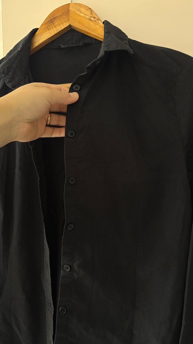 Düğmeli, yaka detaylı ve uzun kollu siyah kadın gömleği, satenimsi esnek kumaştan üretilmiştir. Slim fit Defosu yoktur