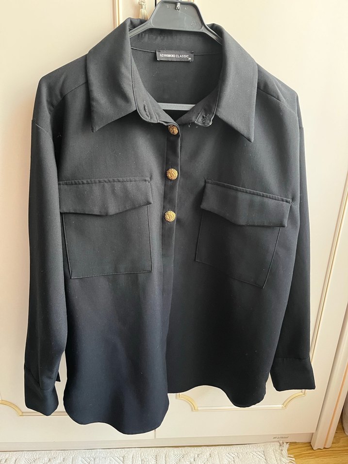 Düğmeli, siyah kadın gömlek, yakası kesik, uzun kollu ve bol kesimdir.cep detaylı kalın be boş kesim 40 42 bedene kadar olur