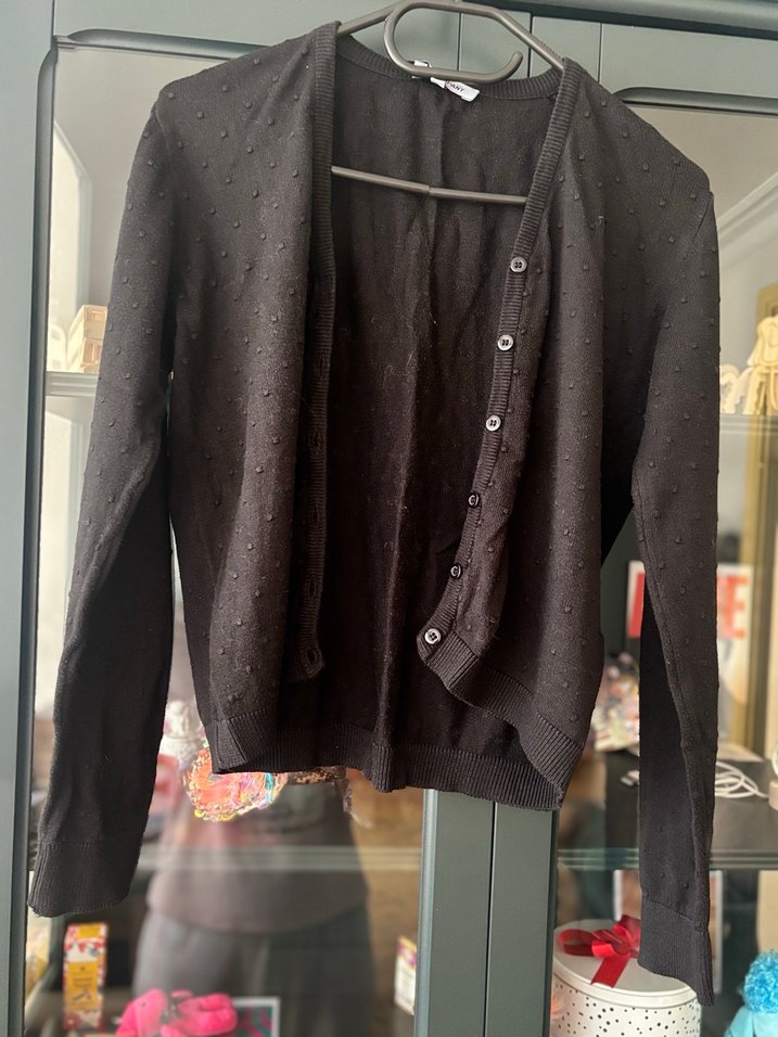 Bu siyah örme hırka, düğmeli, uzun kollu ve notlu yakalıdır.