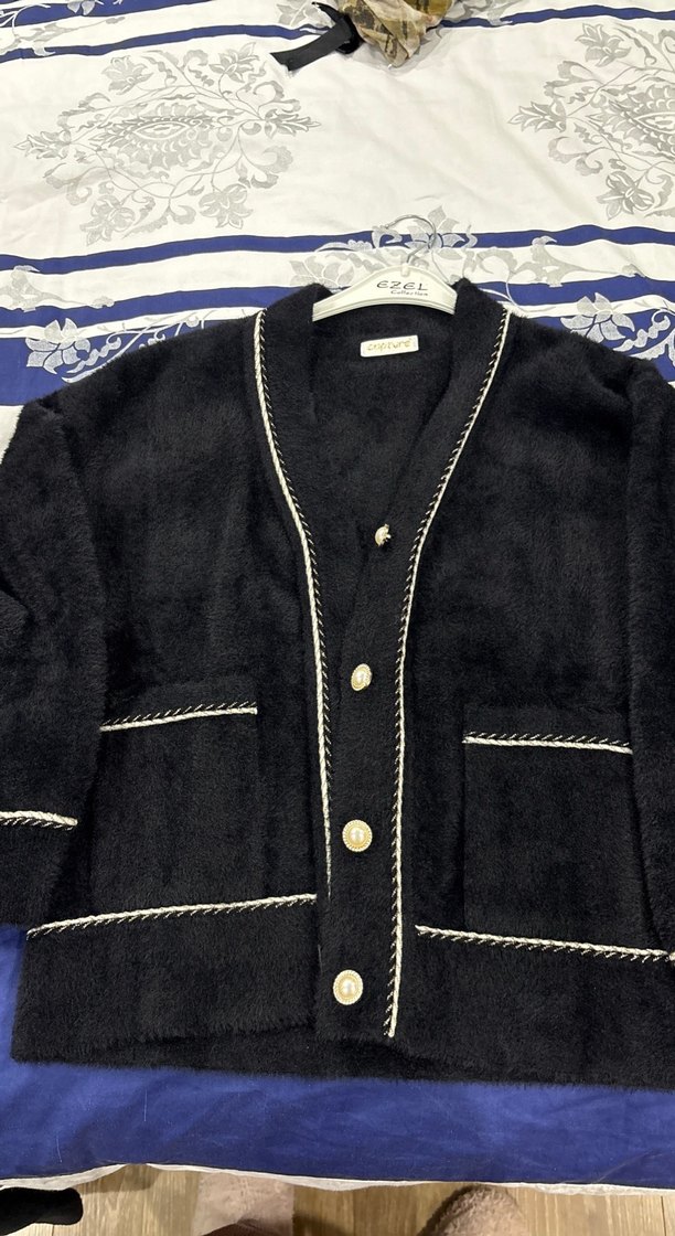 Düğmeli, kesik yakalı siyah kadın hırkasıdır. Uzun kollu, bol kesim ve yumuşak, sıcak dokuludur. Günlük kullanıma uygundur. Yepyenidir