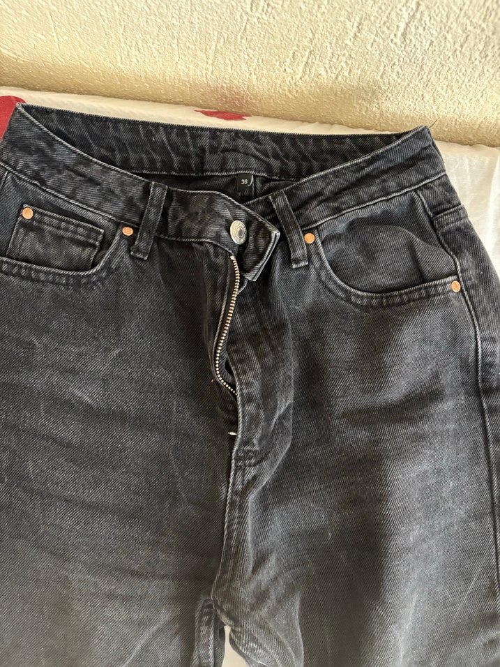 Düğmeli, siyah denim kumaştan yapılmış kadın jean. Günlük kullanım için uygun, desen içermeyen ve rahat bir kesime sahip.