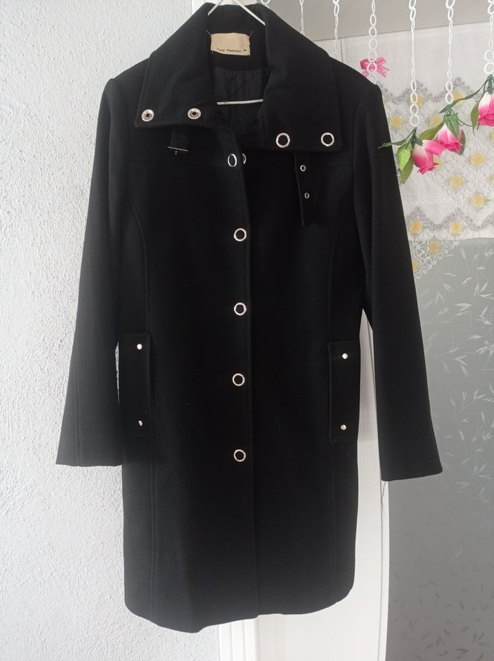 Uzun kollu siyah kaban, ön ve cep detaylarında düğme ve metal halkalar bulunur. Serin havalar için uygundur .