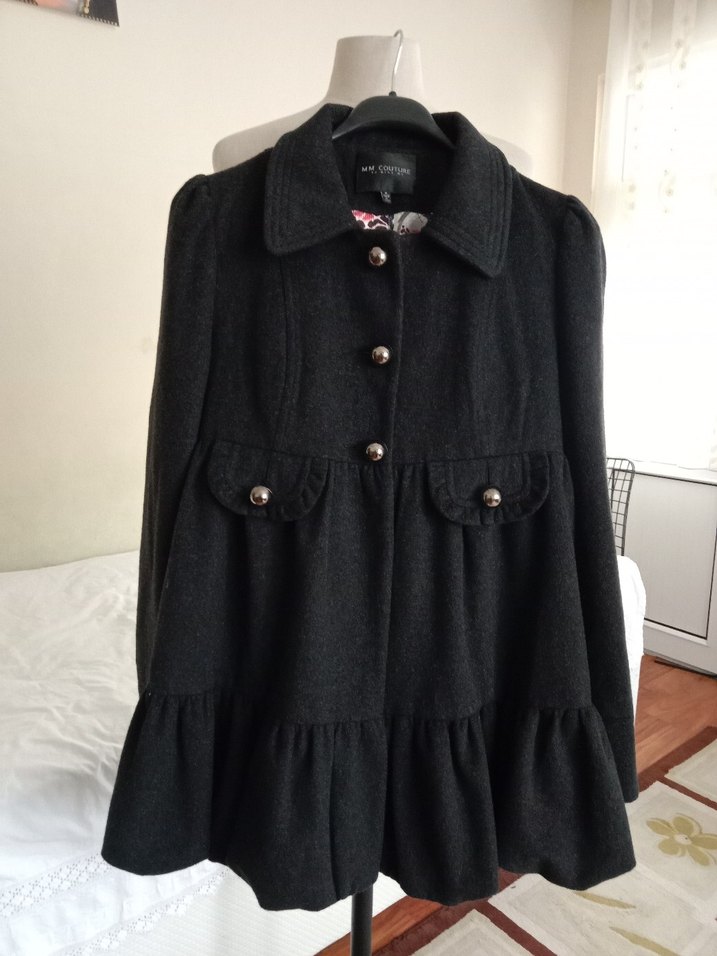 Düğmeli, cep detaylı ve volanlı etek uçlu siyah kadın kabanı. Klasik yakalı, yumuşak ve sıcak kumaştan yapılmıştır.