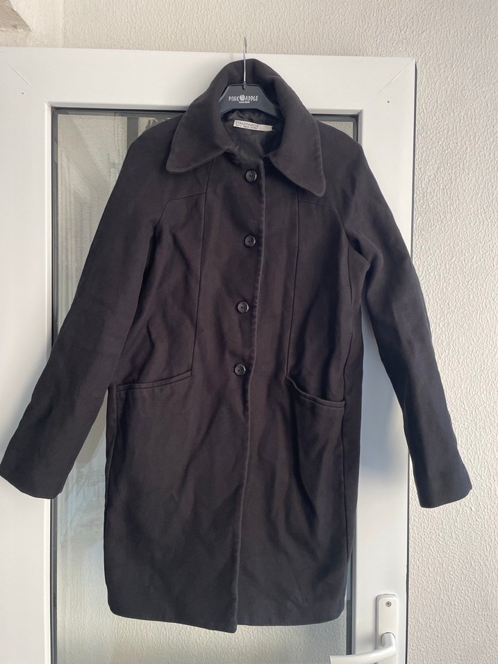 Düğmeli ve klasik yaka detaylı, iki cepli siyah kadın kaban. Sade ve şık tasarımıyla soğuk havalar için uygun.