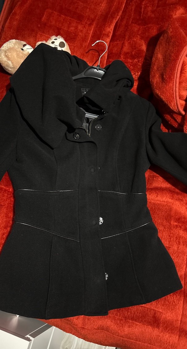 Düğmeli ve bel kısmı oturan siyah kadın kabanı. Yapılı yakası ve uzun kollarıyla klasik ve şık bir tasarıma sahiptir. Beli sarar vintage butik üründür