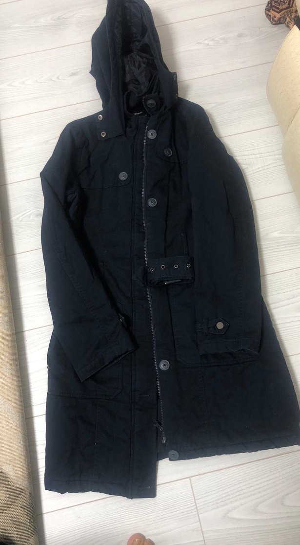 Düğmeli önü, kesik yaka ve uzun kollu, siyah kumaştan dar kesim kaban