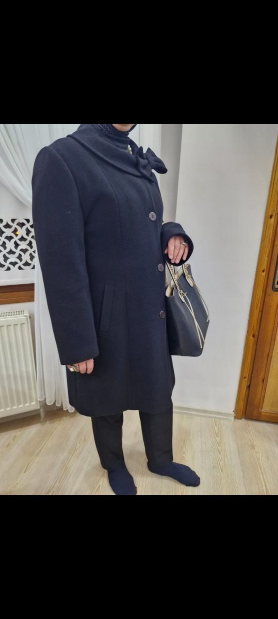 Düğmeli ve yakasında süs fiyonk detaylı siyah kadın kaban. Düz kesim ve uzun kollu, soğuk havalar için uygun yumuşak kaşe kaban.#Tertemiz siyah kaşe mont.herhangi olumsuz bir deformasyonu yoktur orjinal olmayan çantayida hediye yollayacağım.Kol boyu 62 cm iki kol arası 60 cm uzunluk 90 cm sorarak alın iade kabul etmiyorum