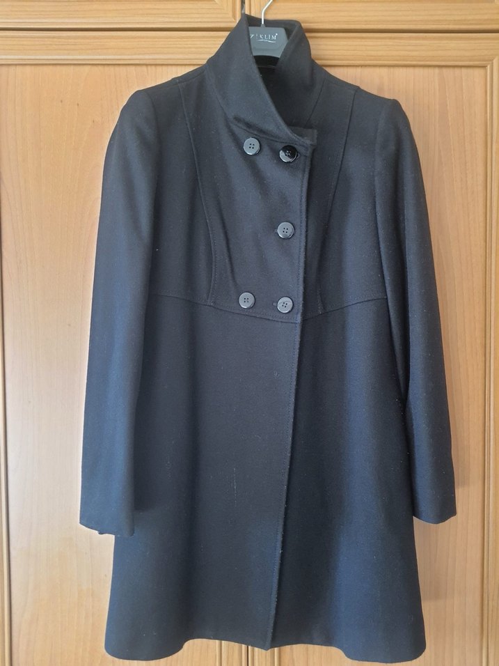 Yüksek yakalı, çift düğmeli siyah kadın kaban, klasik ve şık bir görünüm sağlar.