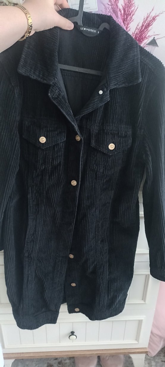 Düğmeli siyah kadife kadın ceket, notalı yaka ve uzun kollu. Normal kesim ve midi boyda, günlük sokak stili için uygundur. Desensiz ve rahat bir modeldir. bol kesim s-m uygun. Ben L giyerken bile kullandim. sayili giyildi.