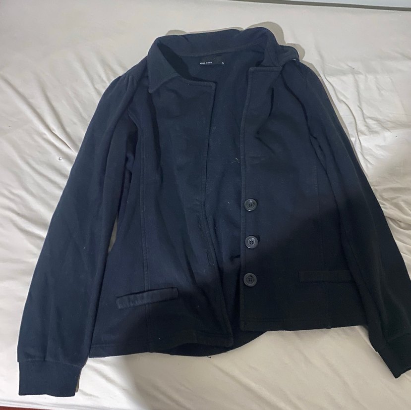 Düğmeli, keten kumaştan siyah kadın blazer. Notch yaka, uzun kollu, bol kesim ve midi boyda, günlük kullanıma uygun.
