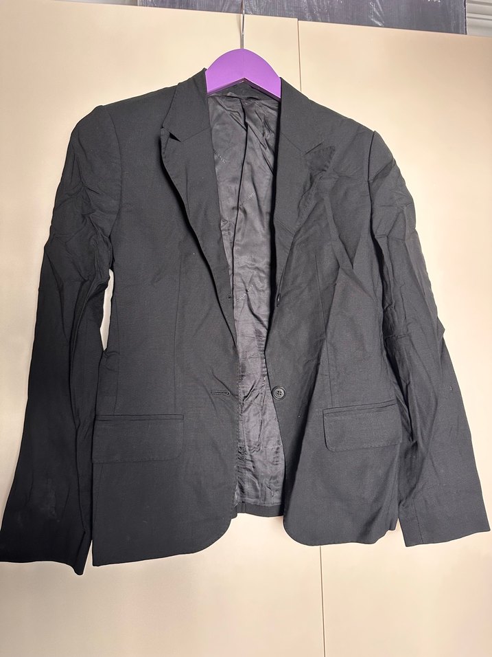 Düğmeli, keten kumaştan yapılmış siyah kadın blazer ceket, normal boy ve regular fit ile ofis ve sokak stiline uygun uzun kolludur.