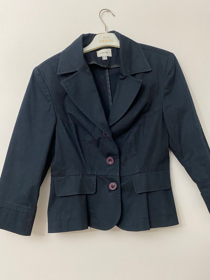 Düğmeli, keten kumaştan lacivert blazer ceket, normal boy ve regular fit. Uzun kollu, desen içermeyen tasarımıyla ofis ve günlük kullanıma uygundur.