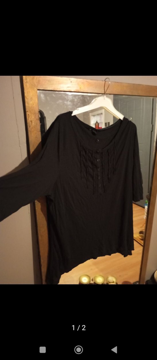 Düğmeli önü, yuvarlak yaka, uzun kollu, midi boy, siyah keten kumaştan bol kesim kadın gömlek.