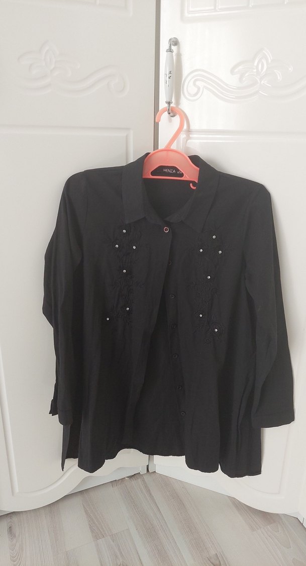 Uzun kollu, keten kumaştan, düğmeli siyah gömlek. Notlu yaka ve midi boy, günlük kullanıma uygun rahat kesim.