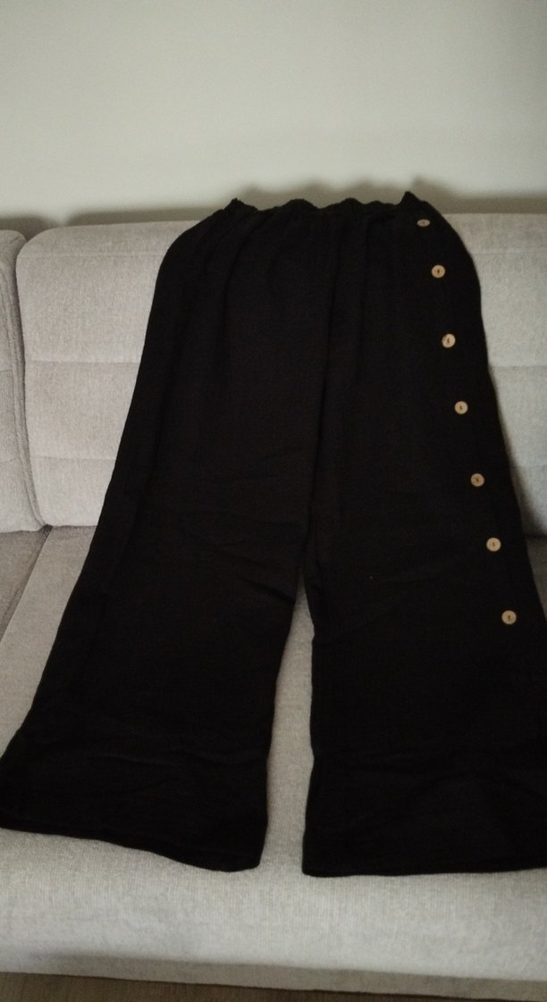 Düğmeli detaylara sahip, bol kesim uzun siyah keten pantolon. Rahat ve günlük kullanıma uygun, trend goth tarzında.