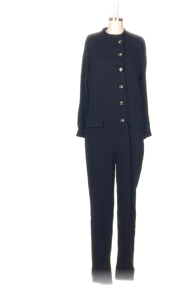 Düğmeli, uzun kollu siyah keten tulum, normal kesim ve midi boyda. Notched lapel yakalı, ofis için uygun, trend casual tarzda. M beden sorunsuz