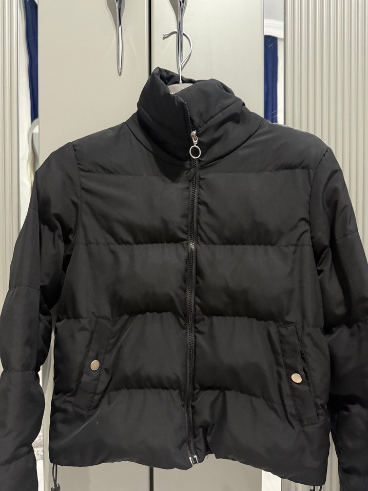 Yüksek yakalı, düğmeli cepli, siyah kadın kışlık mont. Uzun kollu, normal midi boyda, yumuşak ve sıcak kumaştan günlük kullanıma uygun.