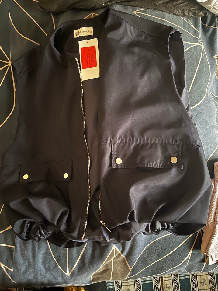 Düğmeli, siyah parlak sentetik kumaştan kolsuz ceket. Notlu yaka ve bol kesim, midi boyda, günlük sokak stiline uygun. M ve L bedene olur.