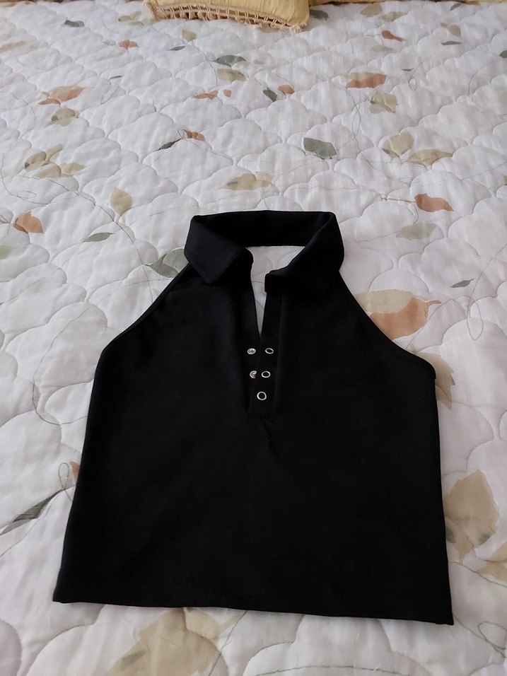 Düğmeli, yakalı, kolsuz siyah kadın crop. Sentetik kumaştan, vücuda oturan ve midi boyda, günlük kullanıma uygun.