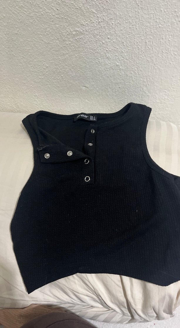 Siyah, kolsuz, düğmeli crop top. Yüksek yakalı, sentetik kumaştan, günlük kullanıma uygun minimal ve dar kesim.