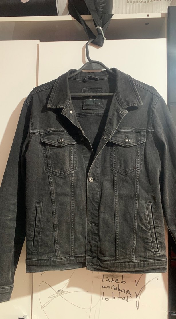 Düğmeli, siyah renkli ve fitted kesime sahip kot ceket. Notched lapel yaka ve uzun kollu, günlük sokak stili için uygundur.