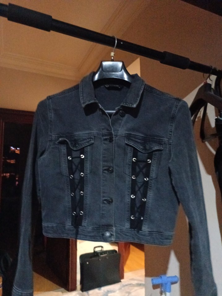 Düğmeli, sıkı kesim siyah kot ceket, nakış detaylı ve askılı kollu, trend sokak modasına uygun.