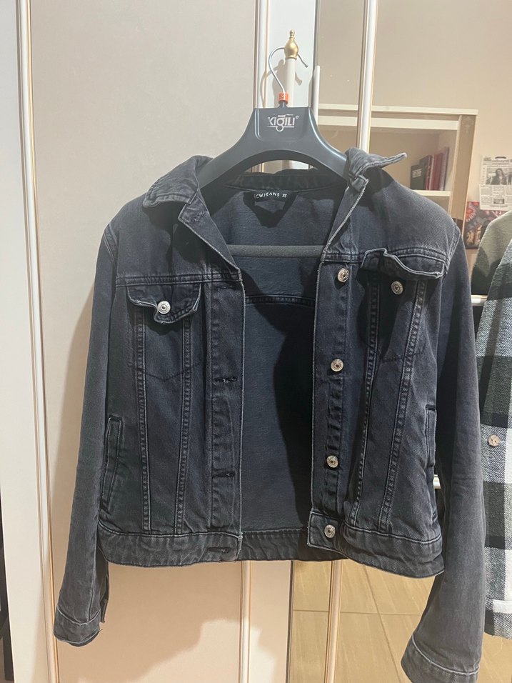 Düğmeli ve kesimli siyah kot ceket, uzun kollu ve notched yakaya sahiptir. Günlük sokak stiline uygundur.