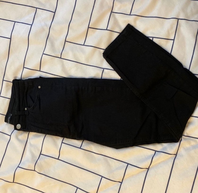 Düğmeli, siyah kadın kot pantolon. Regular fit ve rahat bir dokusu vardır. Günlük sokak stiline uygundur.