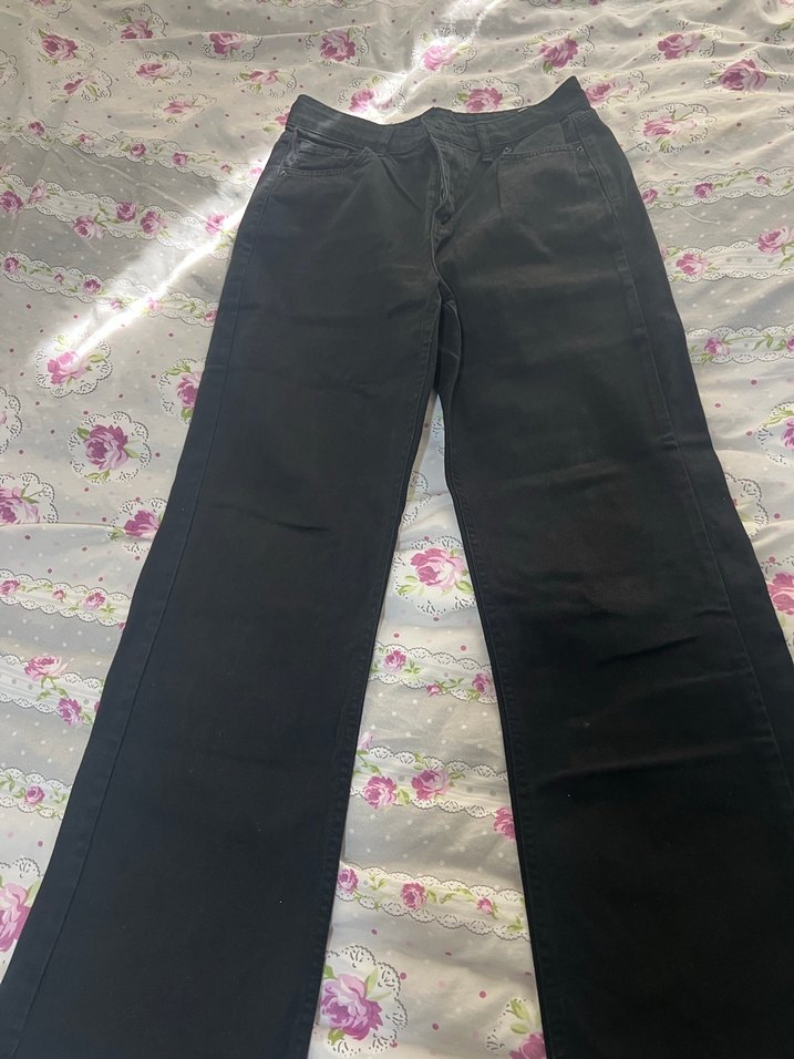 Düğmeli, normal boy, düzenli kesim siyah kot pantolon. Günlük rahat ve sokak stiline uygun.