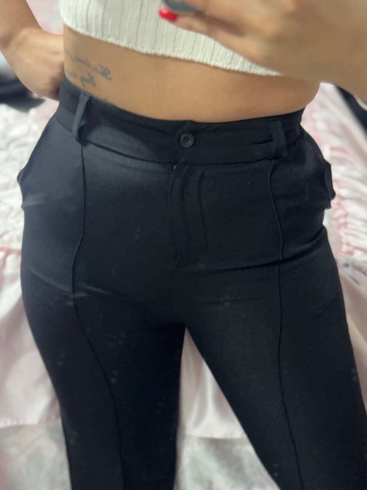 Düğmeli, midi boy siyah kadın kumaş pantolon, ince ve ipeksi dokulu, günlük ve sokak stiline uygun.