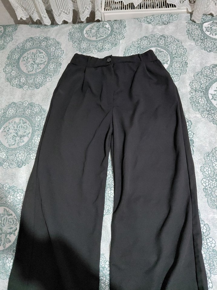 Pazarlık payı vardır. Ürün yeni, paketten yeni çıkarttım. Düğmeli, siyah renkli, sentetik kumaştan üretilmiş, bol kesim ve midi boy kadın kumaş pantolon. Ofis kullanımı için uygun.