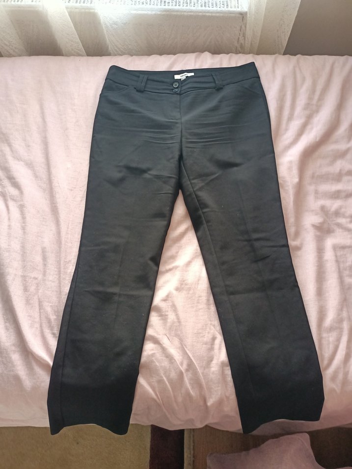 Düğmeli, normal boy, düz siyah kadın kumaş pantolon. Ofis için uygun, sentetik kumaştan üretilmiştir.