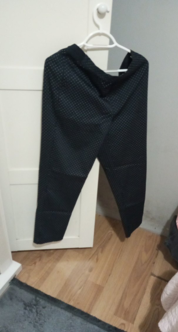 Siyah, midi boy, düğmeli kadın kumaş pantolon. Normal kesim ve minimalist tarzda, ofis kullanımı için uygun.