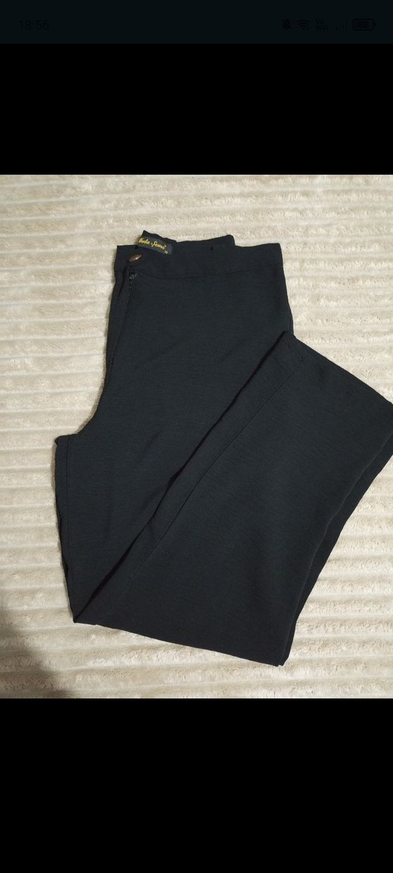 Siyah renkli, düğmeli, rahat kesim ve normal boyda kadın kumaş pantolon. Yumuşak ve sıcak kumaştan üretilmiştir, günlük kullanıma uygundur.