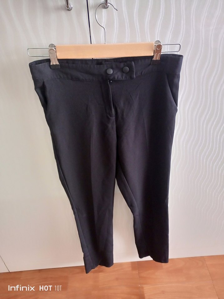 Düğmeli, midi boy, siyah kumaş pantolon, ofis için uygun, rahat kesim ve şık görünüme sahip.