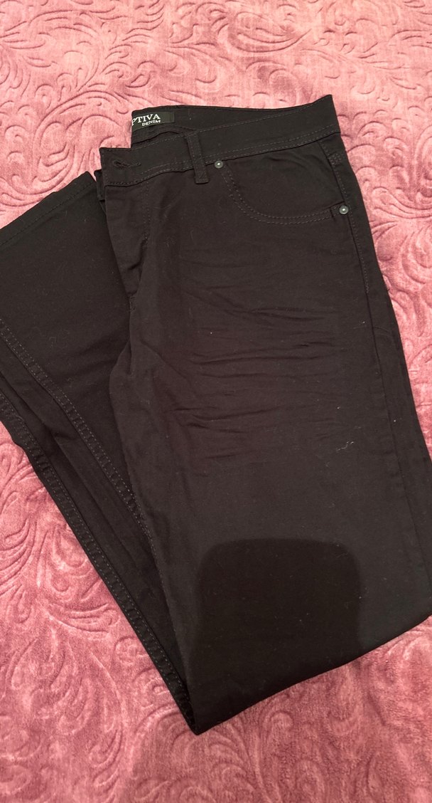 Düğmeli, siyah erkek pantolon. Sentetik kumaştan, günlük sokak tarzı için uygun.
