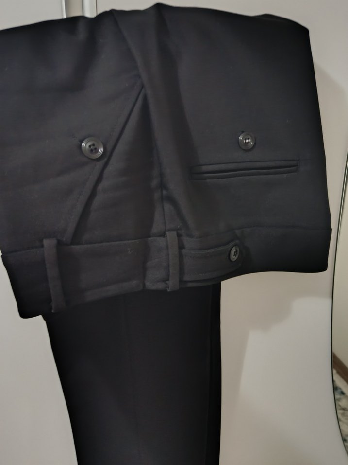 Düğmeli, düz siyah kadın kumaş pantolon. Sentetik kumaştan, normal boy, ofis ve günlük stil için uygundur.