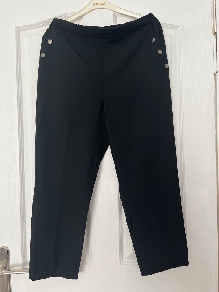 Düğmeli detaylara sahip siyah kadın kumaş pantolon, normal kalıp ve midi boyda. Yumuşak sentetik kumaştan, günlük kullanıma uygun. ✨