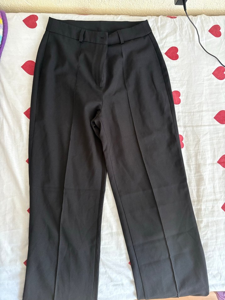 Düğmeli, siyah renkli, normal boy ve regular fit kadın kumaş pantolon. Ofis için uygun, trend casual tarzda.