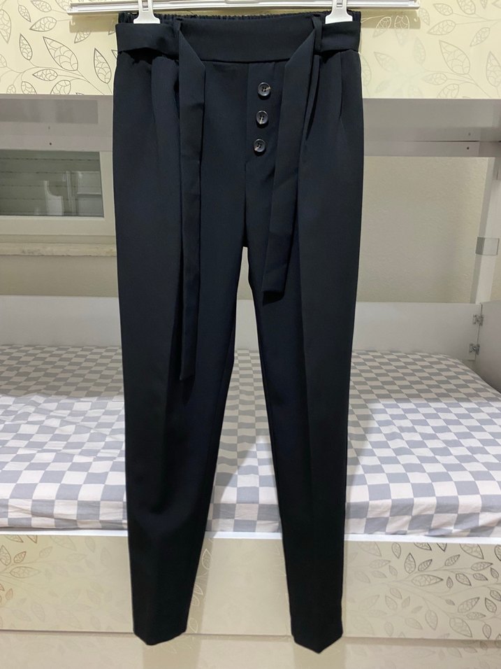Düğme detaylı ön kısmı siyah kadın kumaş pantolon. Ofis ve günlük sokak stiline uygun, rahat kesimli ve sentetik kumaştan. beli lastikli ve kuşaklı.